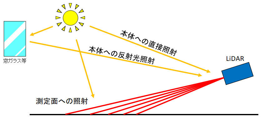 赤外線に負けて測定できません。また、LiDAR本体に太陽光が当たると色々トラブルが