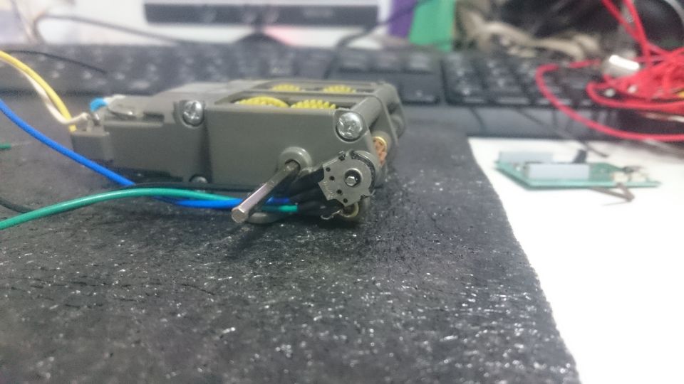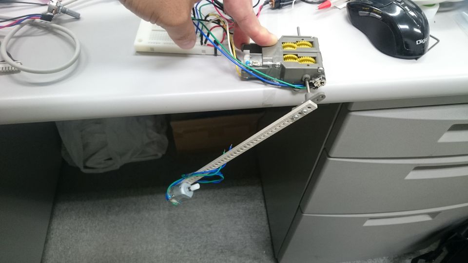出力軸の先に棒とウェイト(モーター)を取り付けて回します。