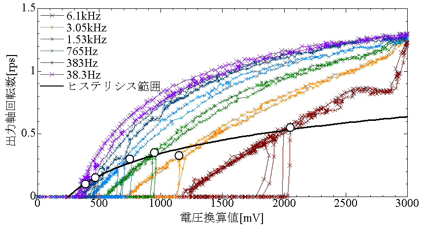 一方、周波数を低くするとヒステリシスが小さくなるものの、比例関係が崩れます。デューティー比25%程度で定格速度の50%ぐらいになります。