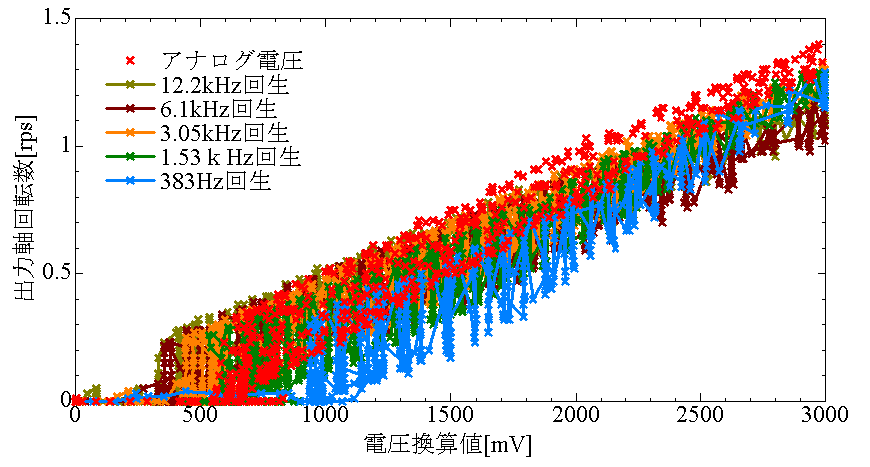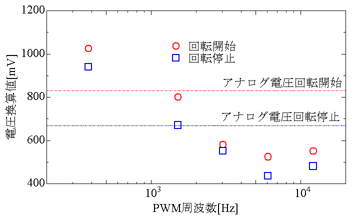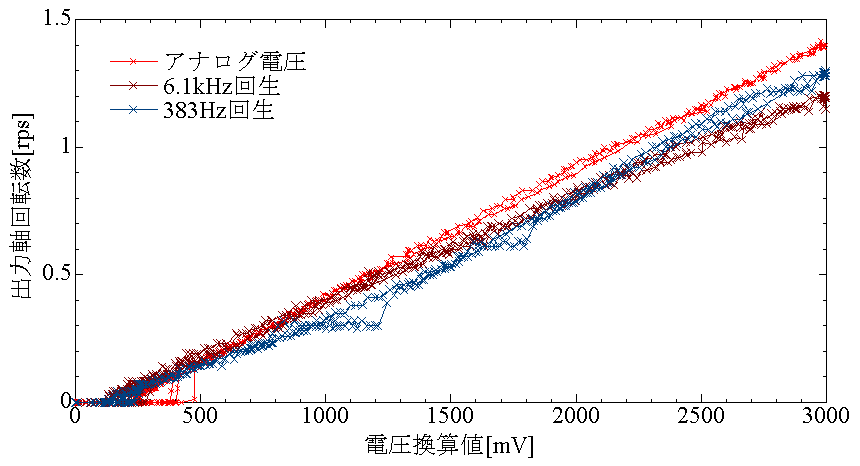 また、ある程度周波数が高いとアナログ電圧を供給した場合よりトルクが大きくなることも確認できました。