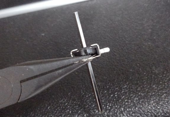 ラジオペンチが無ければ太めのマイナス精密ドライバーで押しつぶしてもいけます。