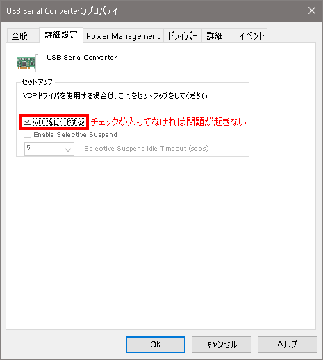 そもそもVCP(バーチャルCOMポート)設定がロードされていない場合はこの問題は起きません。