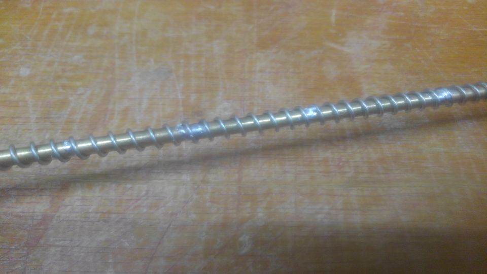 軸に半田の塊があるとネジが引っ掛かるのでコロコロしながら半田ゴテでらせんに沿って半田を伸ばしていきます。半田メッキなどで一度半田が付いた部分には温めるだけで半田が広がっていくのですが、フラックスを塗っただけだとなかなか半田が広がっていきません。