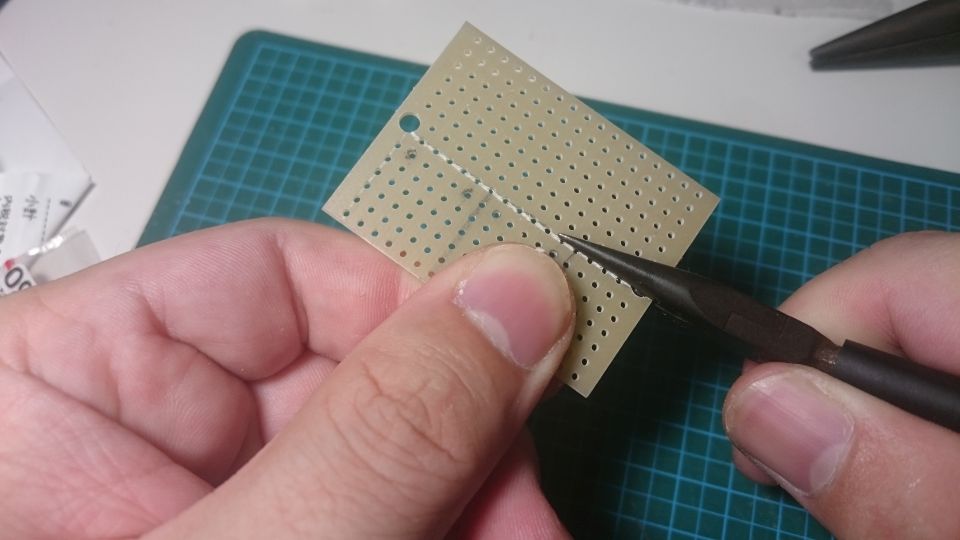 パターンを半田ゴテで熱しすぎるとパターンが剝がれてしまいますが、両面スルーホールだと剥がれることがありません。ただ、基板の表面と裏面にそれぞれ配線をつけて配線を交差させたい場合につなげたくない配線がつながることがよくあります。
