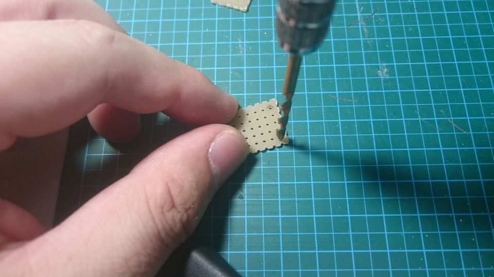 かなり端の方に穴を開ける設計にしたので、ゆっくり回せるハンドドリルかピンバイスを使用します。