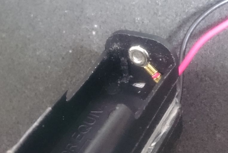 KeepPower18650も秋月で扱っている18650用電池ケースの電池バネを一度外して追加工することで入るようになりました。素の状態で入らなかったので、標準の18650より3mmぐらい長いと思われます。同じく擦り傷が付きます。