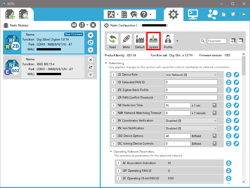 X-CTUにて設定を行いますが、2019/03/01時点ではレガシーバージョンのX-CTU(5.2.8.6)では設定変更を行うことができませんでした。XBee3のファームウェア追加を試しましたが、どうやら対応していない様です。X-CTUの更新は2013年から止まっていますが更新履歴を見ると数年あいてから更新することもある様なのでしばらく様子見です。