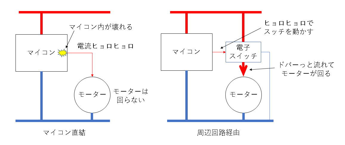 マイコン単体ではモーターを回すことはできません。