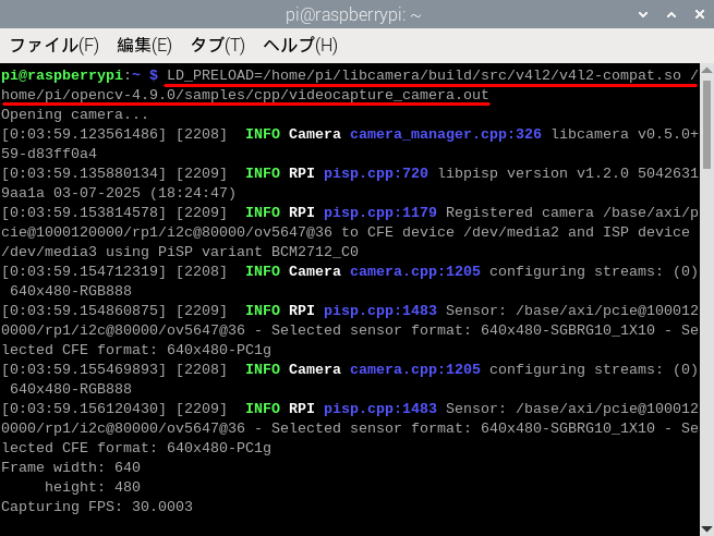 /home/pi/libcamera/build/src/v4l2/v4l2-compat.so /home/pi/opencv-4.9.0/samples/cpp/videocapture_camera.outとなります。