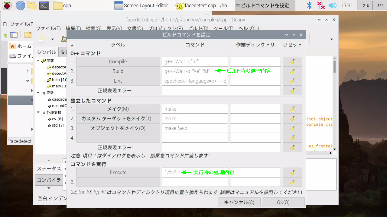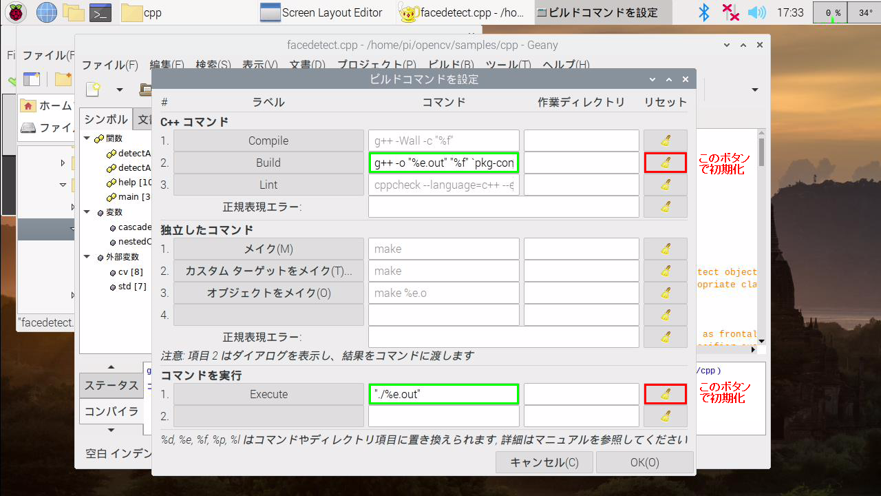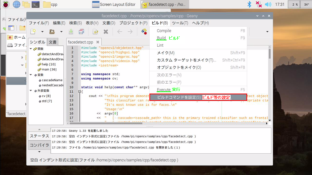まずGeanyにてOpenCVがビルドできるように設定を変更します。