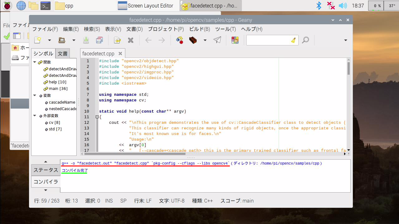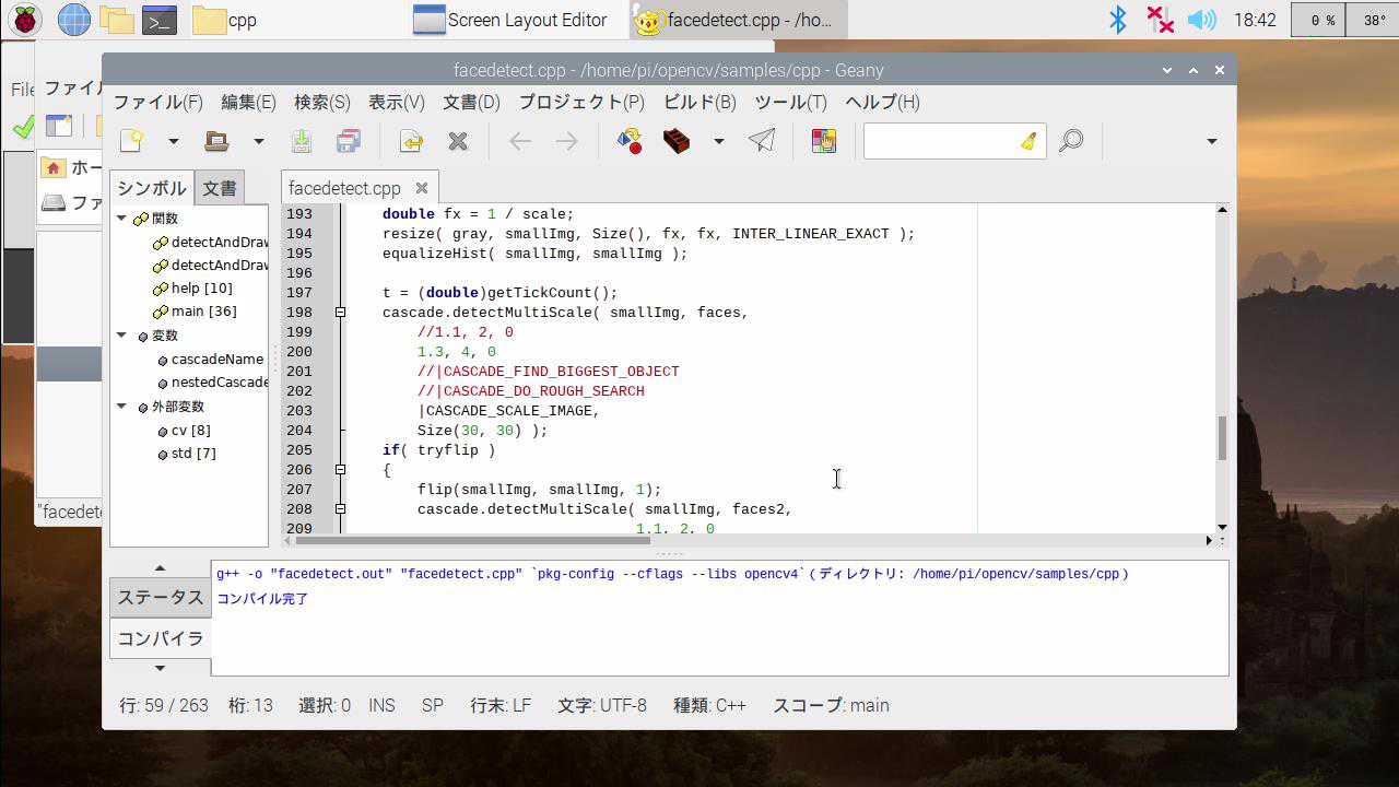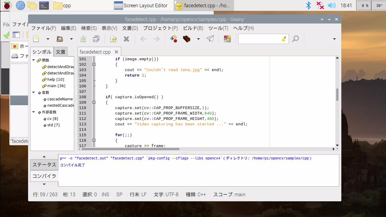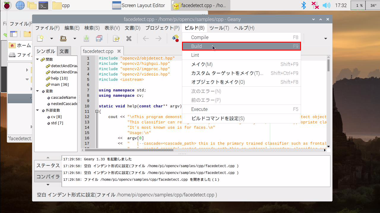 まずGeanyにてOpenCVがビルドできるように設定を変更します。