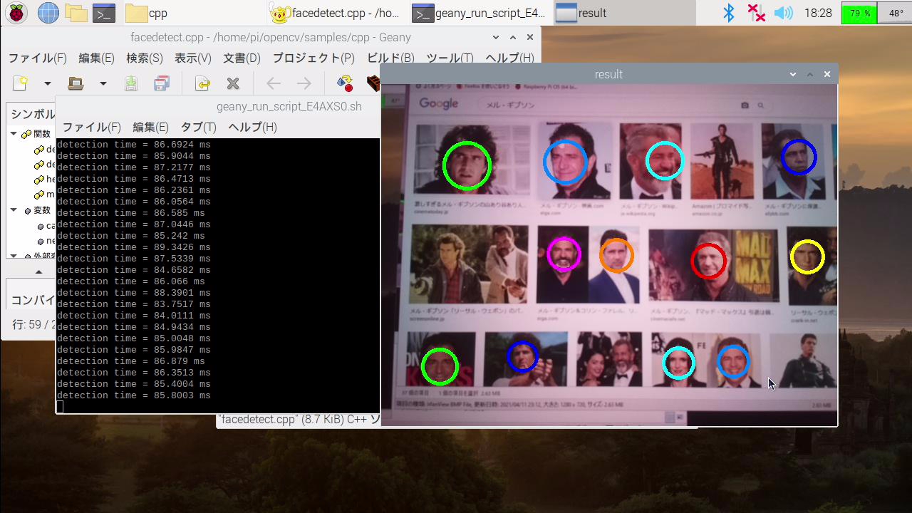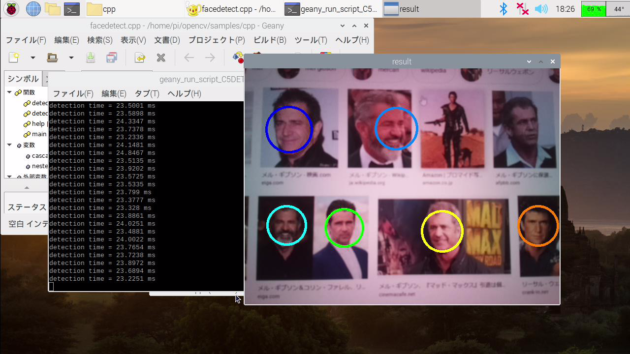 ./facedetect.out -scale=2等と指定すれば1/2サイズで検索できるように作られています。