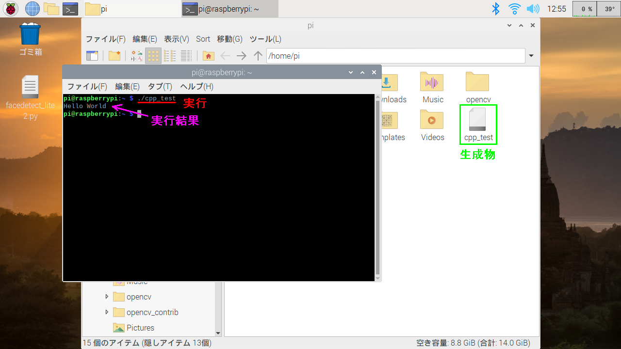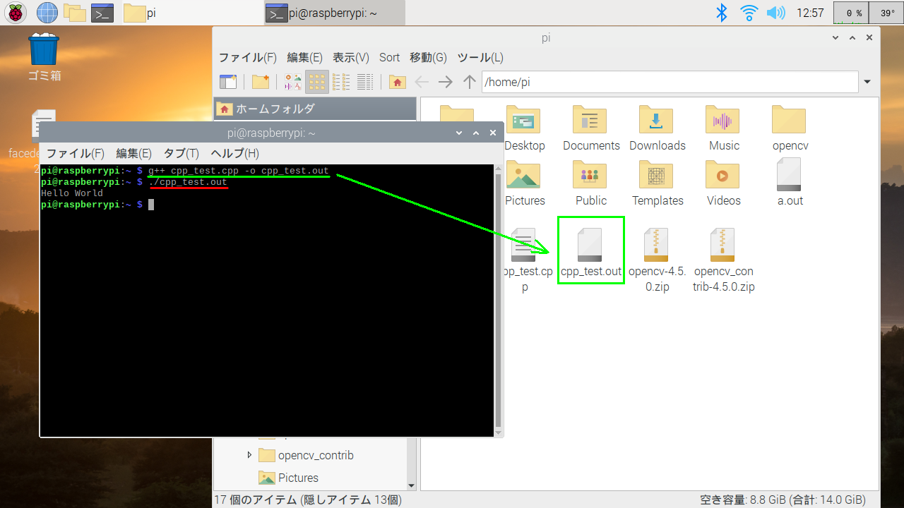 Geanyでビルドすると/home/piにcpp_testが作成されます。