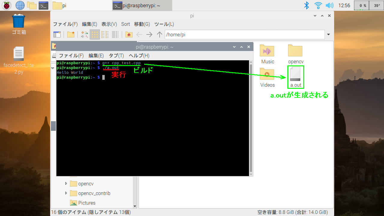 ラズパイでのC++ビルドはほとんど経験が無いのでOpenCVを使う前にHello Woldをしておきます。