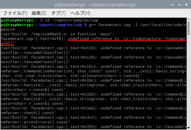 ヘッダがみつかると別のエラーが出ます。※OpenCV3系4系共通