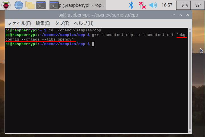 いちいちコマンドを入力するのが面倒なので次回はGeanyのOpenCVビルド設定を行います。