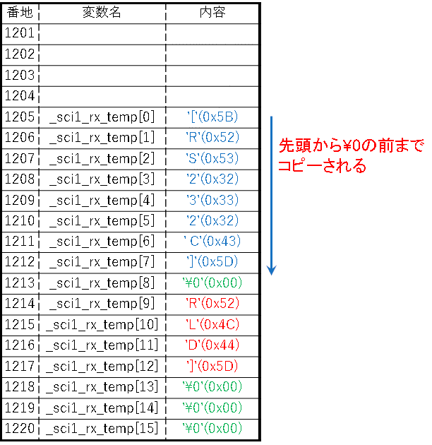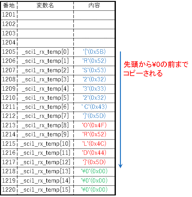 これをコピーすると先ほどと同じ、'\0'が出てくる1218番地で処理が終了するため”[RS232C]ORLD]”となってしまいます。