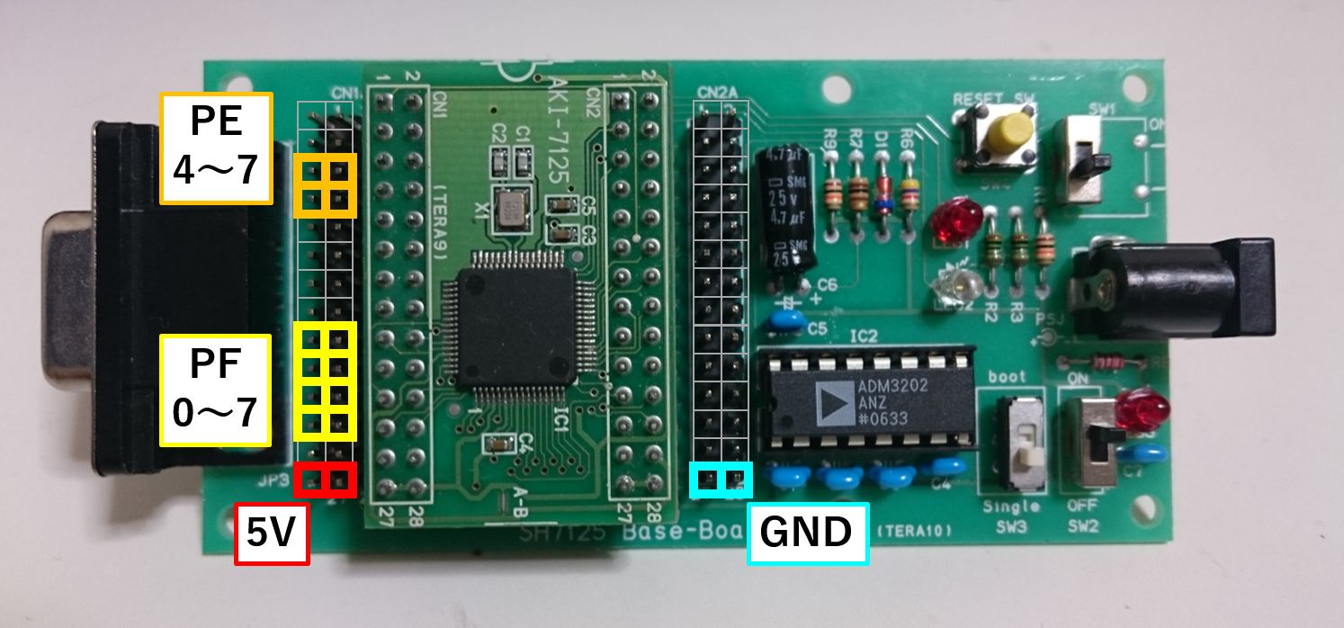 このプログラムを実行するとAN0(PF0)の電圧に応じてベースボードの2つのLEDとPE4~PE7の出力が変化します。