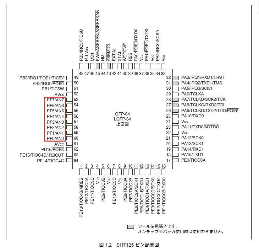 マ イコンのピン色々な機能に割り当てることができますがPF0~PF7にはAN以外の表記がありません。しかもハードウェアマニュアルの「