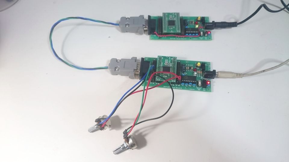 同じプログラムを書き込んだボードを2枚用意し、オスのクロスケーブルでお互いを繋いでやればシリアル通信を使った比例リモート制御ができます。