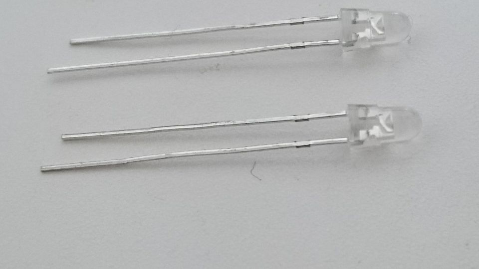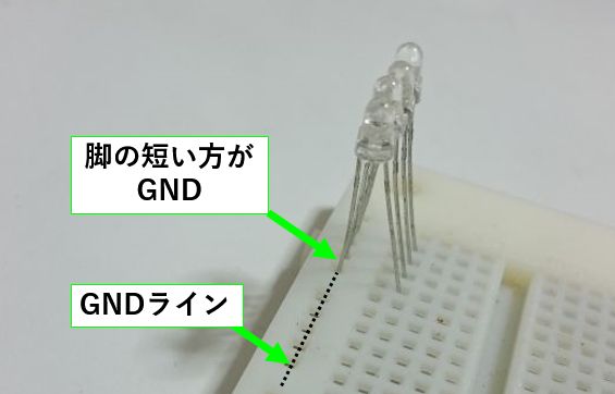 LEDの脚を切っていない限り、長い方がアノード(+)、短い方がカソード(ー)となっています。