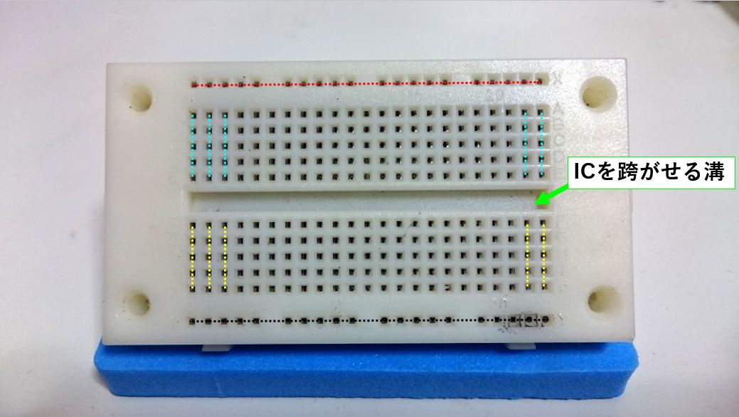 基本的にICをまたがせるための溝があり、溝から直角に配線が伸びています(水色と黄色のライン)。溝に直角な配線は溝で分断されており、水色と黄色のラインは独立しています。また、水色のライン同士、黄色のライン同士も独立しています。