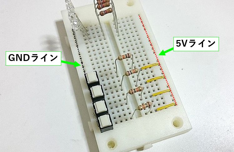 このままではプルアップにならないのでブレッドボード用の配線でGNDラインの反対側の横ラインに接続します。