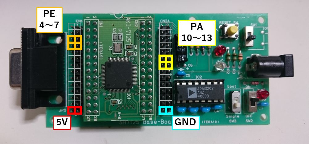 動作が保証されているSW1の入力に対してPE4-7の制御を行います。get_sw1()の条件に対してPE4-7を一斉にONまたはOFFします。これはLED緑の動作に連動します。