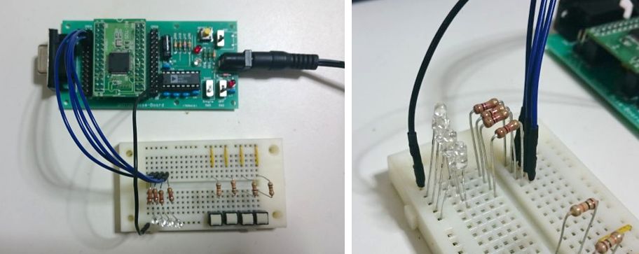 こちら正しく接続された状態でプログラムを実行するとSW1の切り替えに合わせて追加した4つのLEDが一斉に切り替わるはずです。