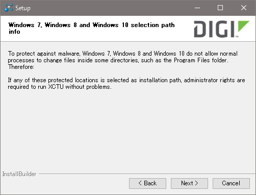 インストール場所としてこれらの保護された場所が選択されると、問題なくXCTUを実行するために管理者権限が要求されます。