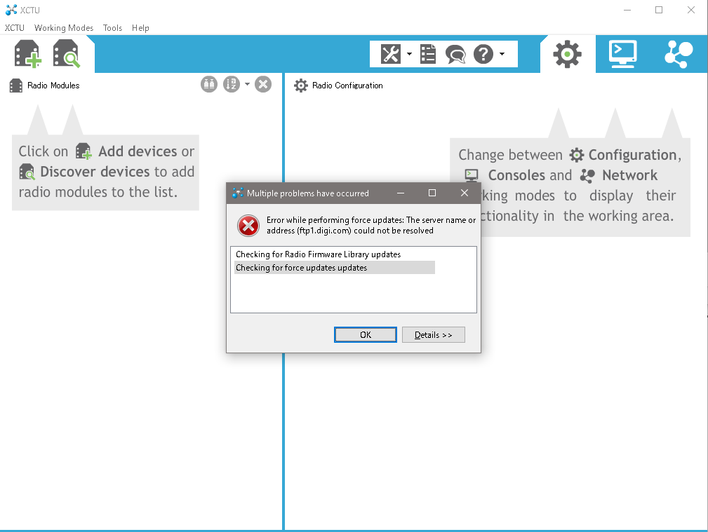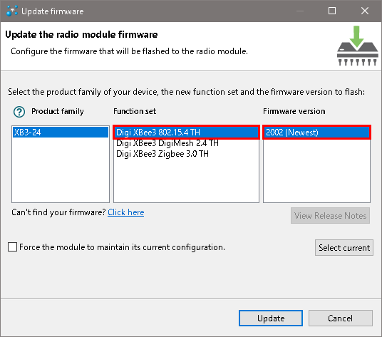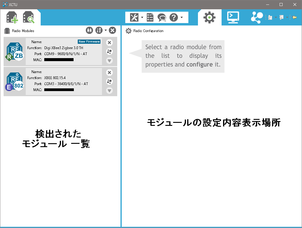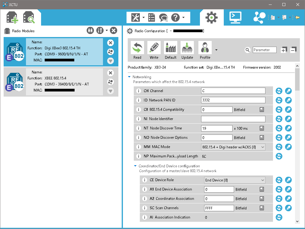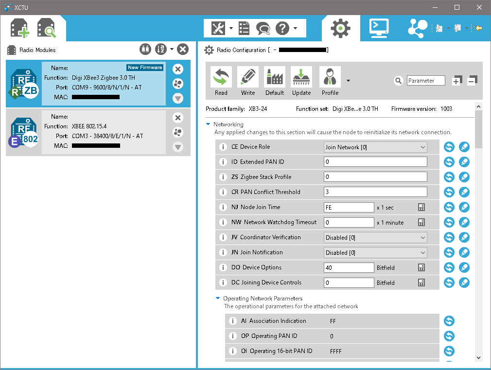 X-CTUにて設定を行いますが、2019/03/01時点ではレガシーバージョンのX-CTU(5.2.8.6)では設定変更を行うことができませんでした。XBee3のファームウェア追加を試しましたが、どうやら対応していない様です。X-CTUの更新は2013年から止まっていますが更新履歴を見ると数年あいてから更新することもある様なのでしばらく様子見です。