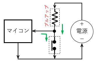 スイッチを押してない時はマイコンの端子が抵抗を経由して電源のマイナス側につながれます。