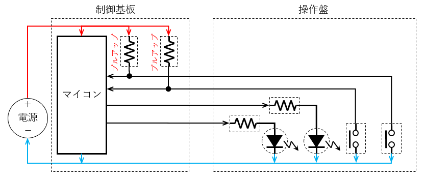 基板のあらゆる個所に配置する事になります。スイッチを増設したい場合、マイコン周辺でプルアップしてしまえば