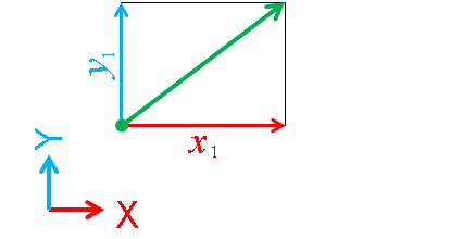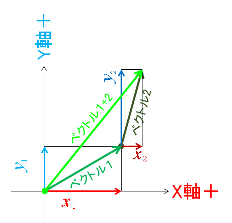 このとき、ベクトル1+2の成分は各軸の値を足し合わせてX方向成分: