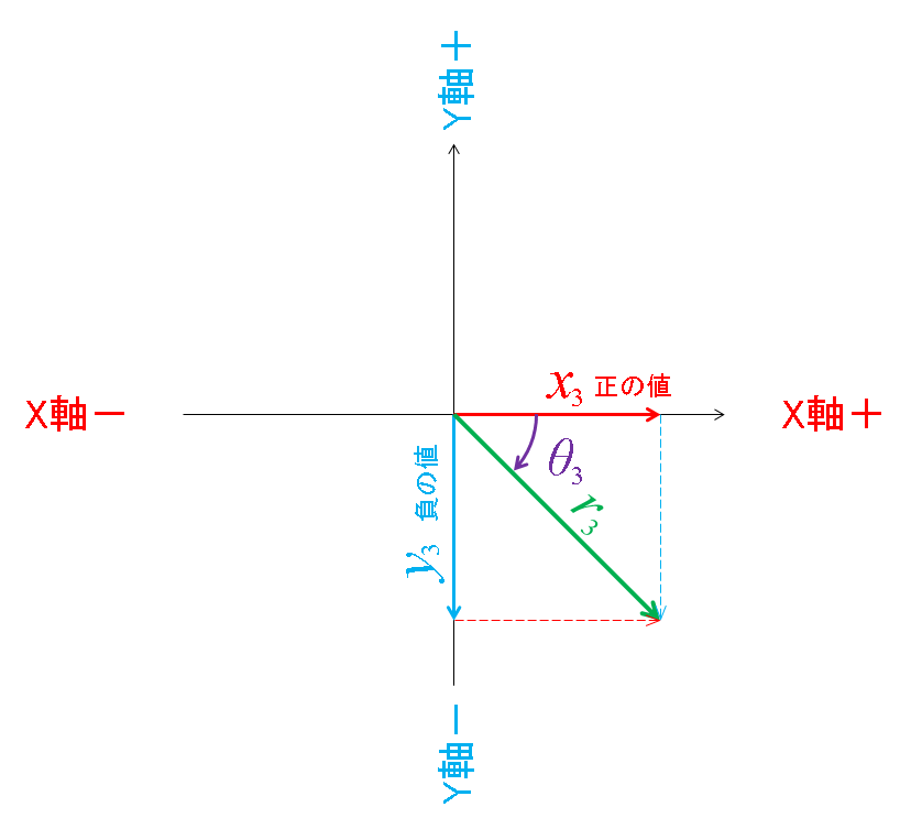 θが0~-90°の間または上からぐるっと回って270°~360°の間だと、xが正、yが負になります。