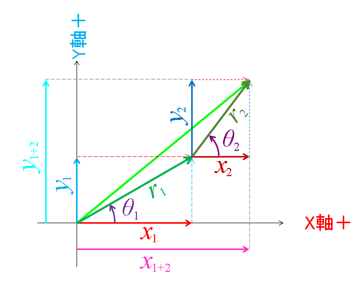 黄緑のベクトルのX方向成分、Y方向成分はそれぞれ
