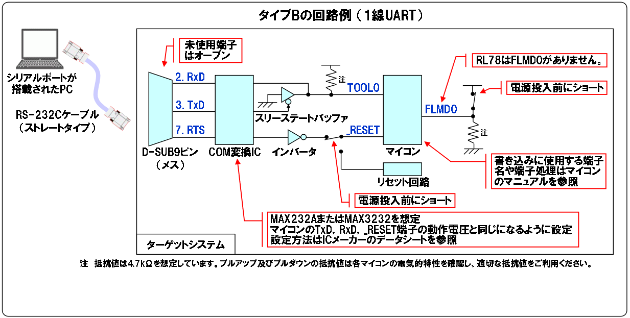 必要な回路の概要は「PCのシリアルポートを使用した書き込み回路例」にてググれば出てきます。