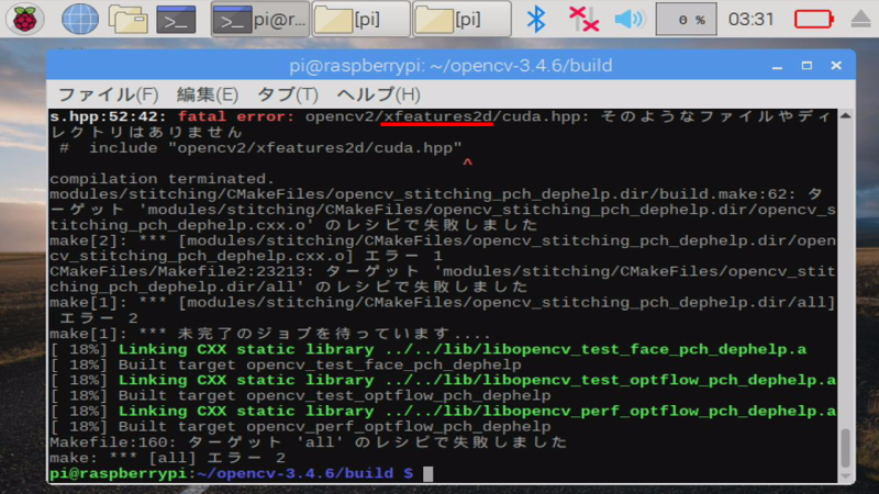 そこで、先のcmakeコマンドのオプションにxfeature2dをビルドしない設定を追加します。